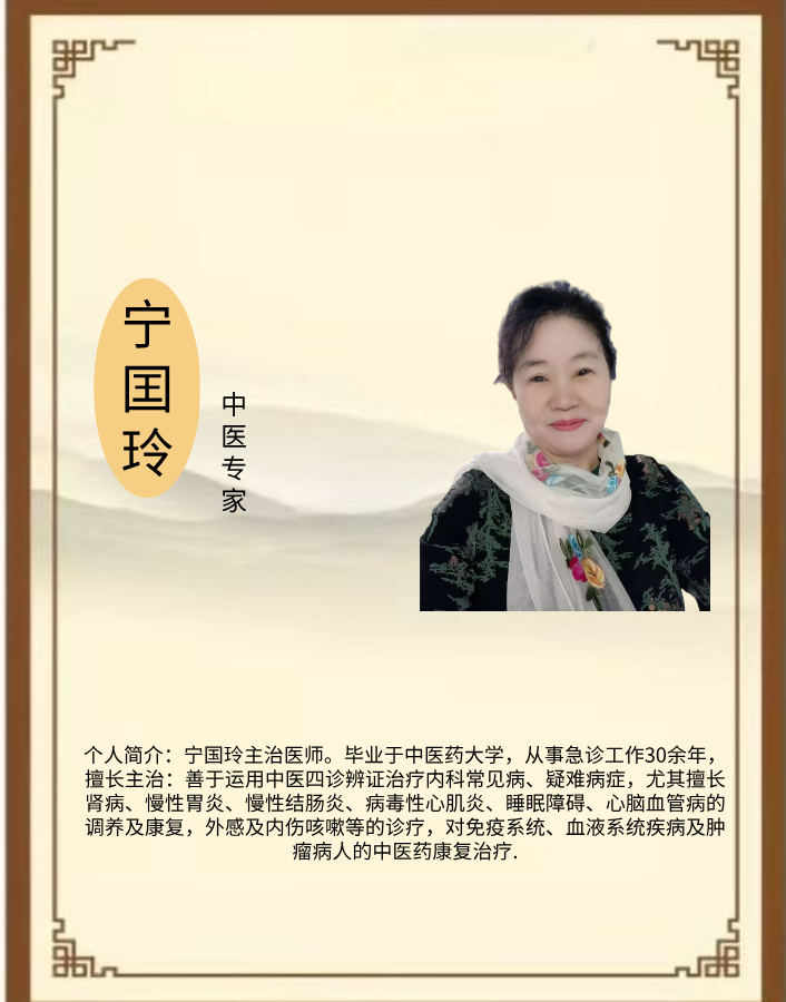 宁国玲主治医师。毕业于中医药大学,从事急诊工作30余年,擅长主治:善于运用中医四诊辨证治疗内科常见病、疑难病症,尤其擅长肾病、慢性胃炎、慢性结肠炎、病毒性心肌炎、睡眠障碍、心脑血管病的调养及康复,外感及内伤咳嗽等的诊疗,对免疫系统、血液系统疾病及肿瘤病人的中医药康复治疗。