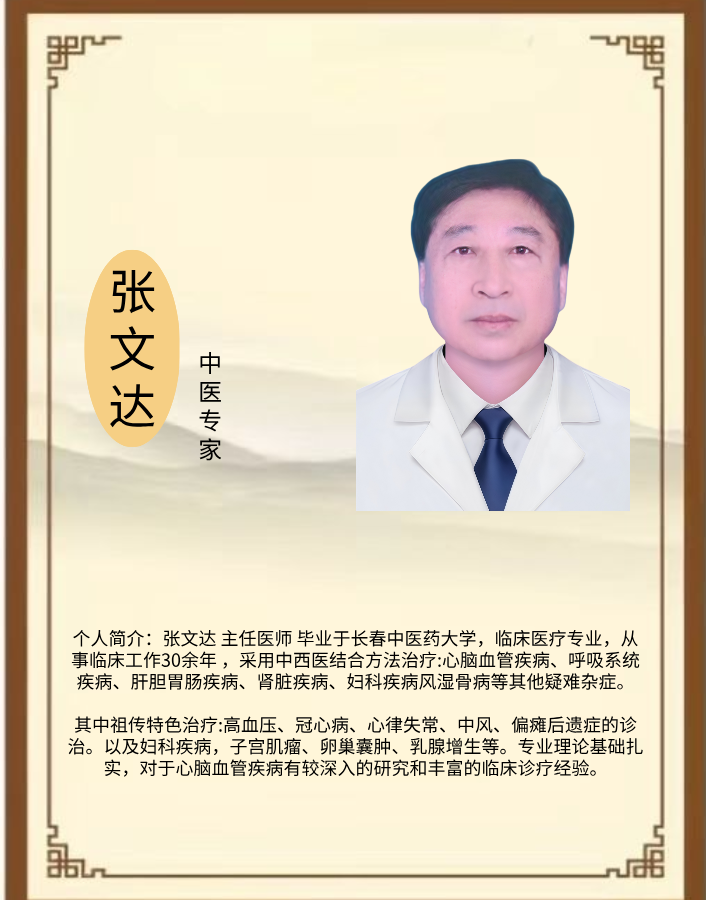 张文达 主任医师 毕业于中医药大学,中西医专业,从事临床工作30余年 主要研究方向是心血管重症、冠心病、高血压、心律失常的诊治,专业理论基础扎实,对于心血管疾病的诊疗有较深入的研究和丰富的临床诊断经验。